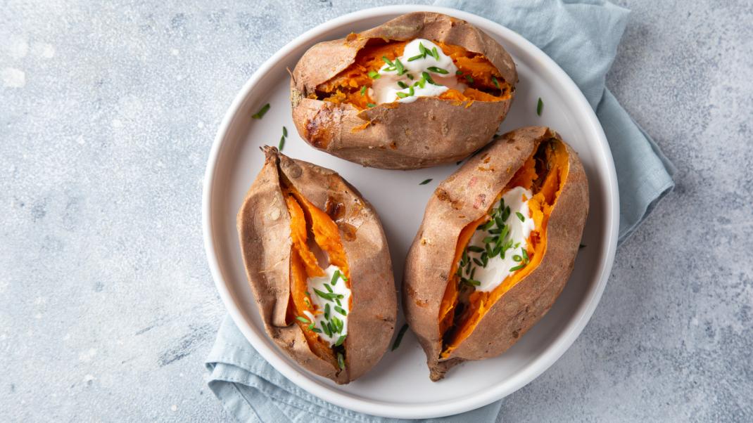 Γευστικές και εξαιρετικά θρεπτικές οι γλυκοπατάτες γίνονται το τέλειο κύριο γεύμα με ένα γρήγορο ψήσιμο στον φούρνο και μόνο δύο επιπλέον υλικά.