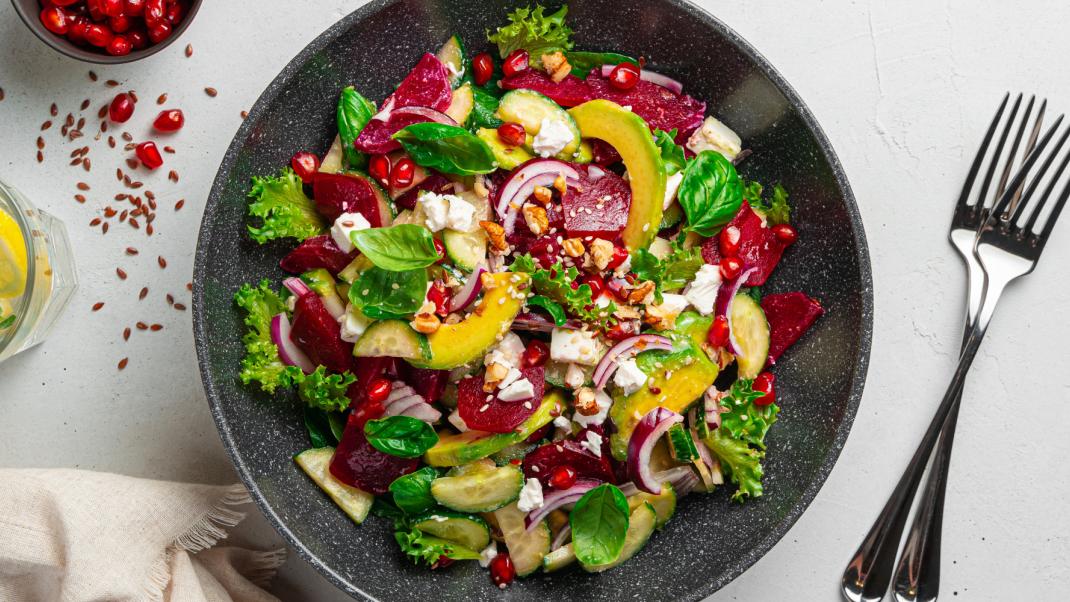 Μια τέτοια συνταγή είναι και αυτή που σας δίνουμε παρακάτω. Στη συγκεκριμένη σαλάτα η βιταμίνη C και το φυλλικό οξύ των πρασινάδων συνδυάζεται με τις φυτικές ίνες των παντζαριών, τα καλά λιπαρά του αβοκάντο και τα αντιοξειδωτικά του ροδιού σε ένα γεύμα γεμάτο πρωτεΐνες και ασβέστιο (φέτα, καρύδια, σουσάμι).