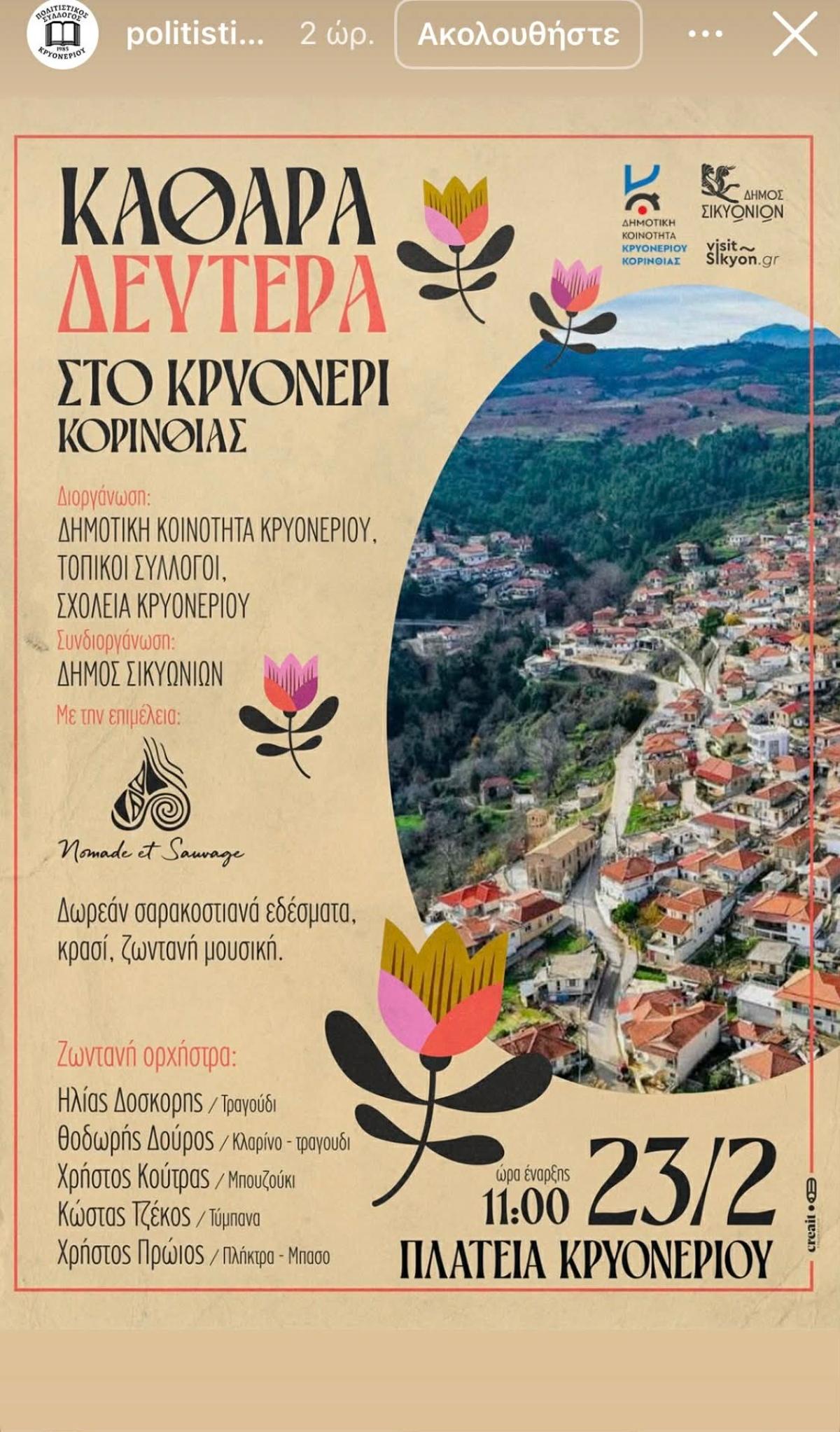 Φέτος, σας προτείνουμε έναν προορισμό που απέχει περίπου 1,5 ώρα από το κέντρο της Αθήνας και ξέρει να γιορτάζει την Καθαρά Δευτέρα όπως της αξίζει. Ο δρόμος οδηγεί στο Κρυονέρι Κορινθίας, το μεγαλύτερο ορεινό χωριό του νομού, έναν τόπο ζωντανό με έντονο πολιτιστικό αποτύπωμα.