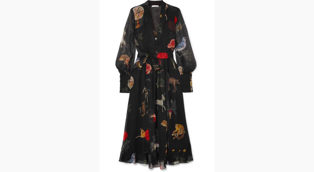 Πρόκειται για ένα μαύρο Oscar de la Renta midi φόρεμα με animal print από μετάξι, με μακριά μανίκια, διαφάνειες, και V neckline.