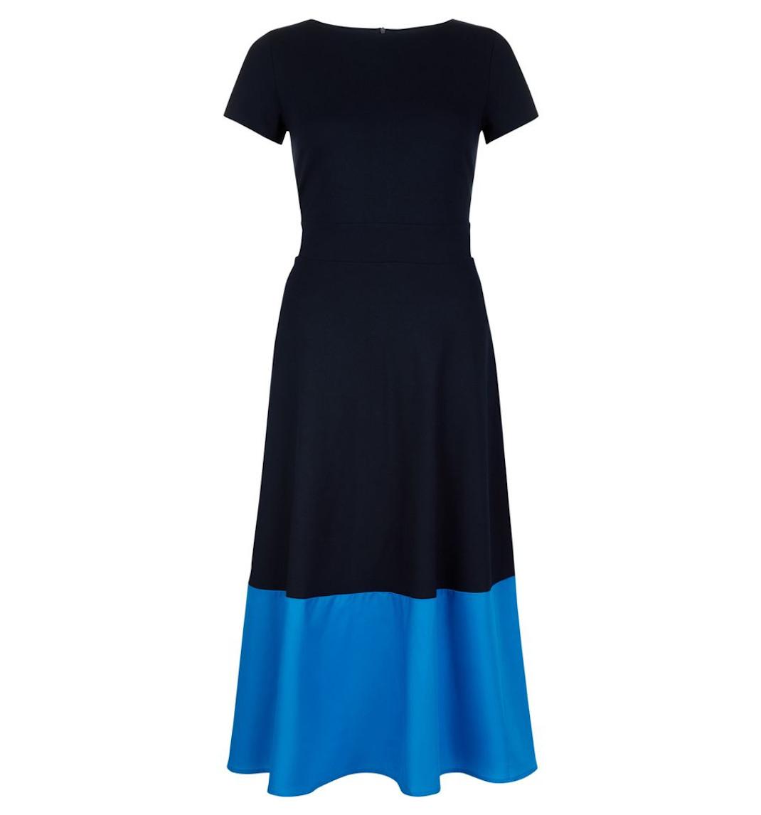 Βρήκαμε το Roksanda Athena μπλε φόρεμα που φόρεσε η Δούκισσα στην επίσκεψή της σε σχολείο στο Σίδνεϊ στην οικονομική εκδοχή του. Πρόκειται για ένα crepe midi φόρεμα, σε δύο τόνους του μπλε, με πτυχές στο τελείωμά του.