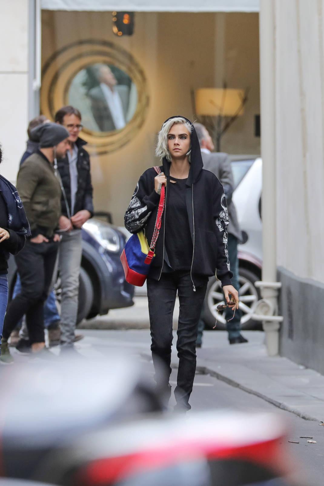H Κάρα Ντελεβίν απαθανατίστηκε από τον φωτογραφικό φακό με total black look με casual χαρακτήρα.