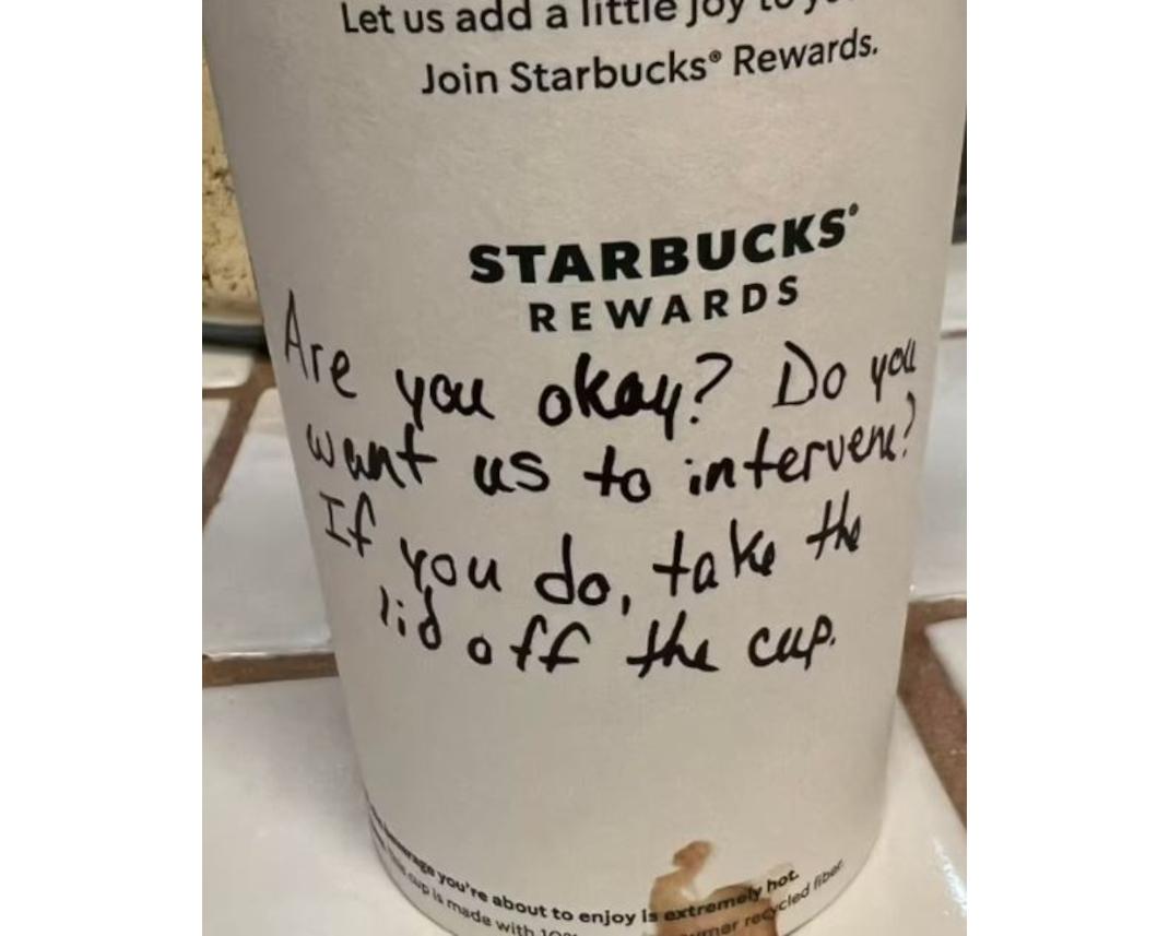 Όμως, πάνω στην κούπα είχε γράψει το εξής μήνυμα: «Είσαι καλά; Θέλεις να επέμβουμε; Αν θέλεις, αφαίρεσε το καπάκι της κούπας».