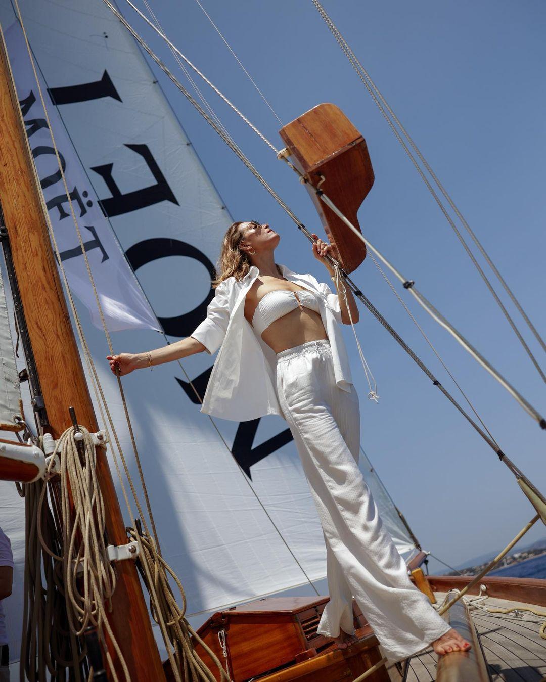 Στις φωτογραφίες ποζάρει στα κατάρτια ενός γιοτ, μεσοπέλαγα στις Σπέτσες και ποζάρει ανέμελη στον φακό. Το beach look της είναι ολόλευκο και απαρτίζεται από ένα λευκό στράπλες μπικίνι και ένα λινό σετ.