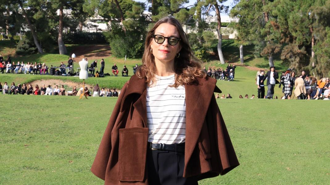 Πάνω από τα δύο αυτά κομμάτια, η Βίκυ Καγιά έριξε ένα καφέ σουέτ πανωφόρι στους ώμους, δίνοντας μια πιο ανεπιτήδευτη και effortless διάθεση στο outfit. Η ζεστή του απόχρωση ταιριάζει πολύ καλά με το πράσινο του υπαίθριου χώρου, αλλά και με τα πιο ουδέτερα χρώματα του συνόλου.