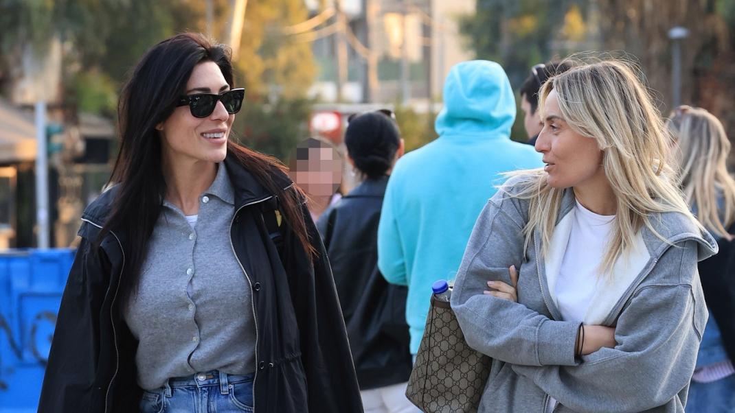 Η Ελεονώρα Μελέτη επέλεξε για τη βόλτα της αθλητική φόρμα, ζακέτα-φούτερ και sneakers, ενώ η Φλορίντα Πετρουτσέλι τζιν και πλεκτή ζακέτα κουμπωμένη σαν τοπ.