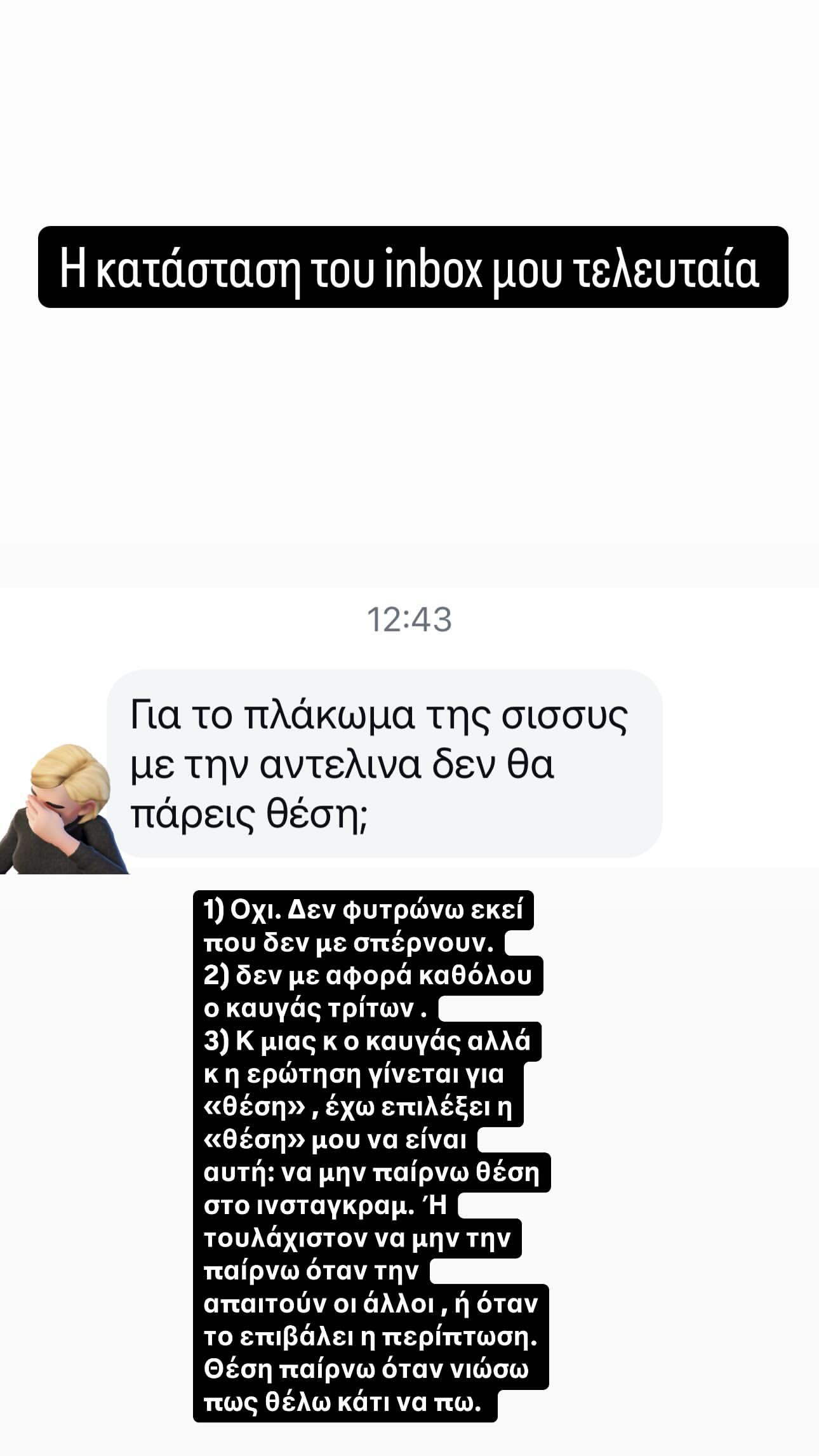 Με τη σειρά της η Ευρωβουλευτής της Νέας Δημοκρατίας απάντησε: «1. Όχι, δεν φυτρώνω εκεί που δεν με σπέρνουν. 2. Δεν με αφορά καθόλου ο καυγάς τρίτων. 3. Και μιας και ο καυγάς αλλά και η ερώτηση γίνεται για “θέση”, έχω επιλέξει η “θέση” μου να είναι αυτή: να μην παίρνω θέση στο Instagram. Ή τουλάχιστον να μην την παίρνω όταν την απαιτούν οι άλλοι ή όταν το επιβάλλει η περίπτωση. Θέση παίρνω όταν νιώσω πως θέλω κάτι να πω».