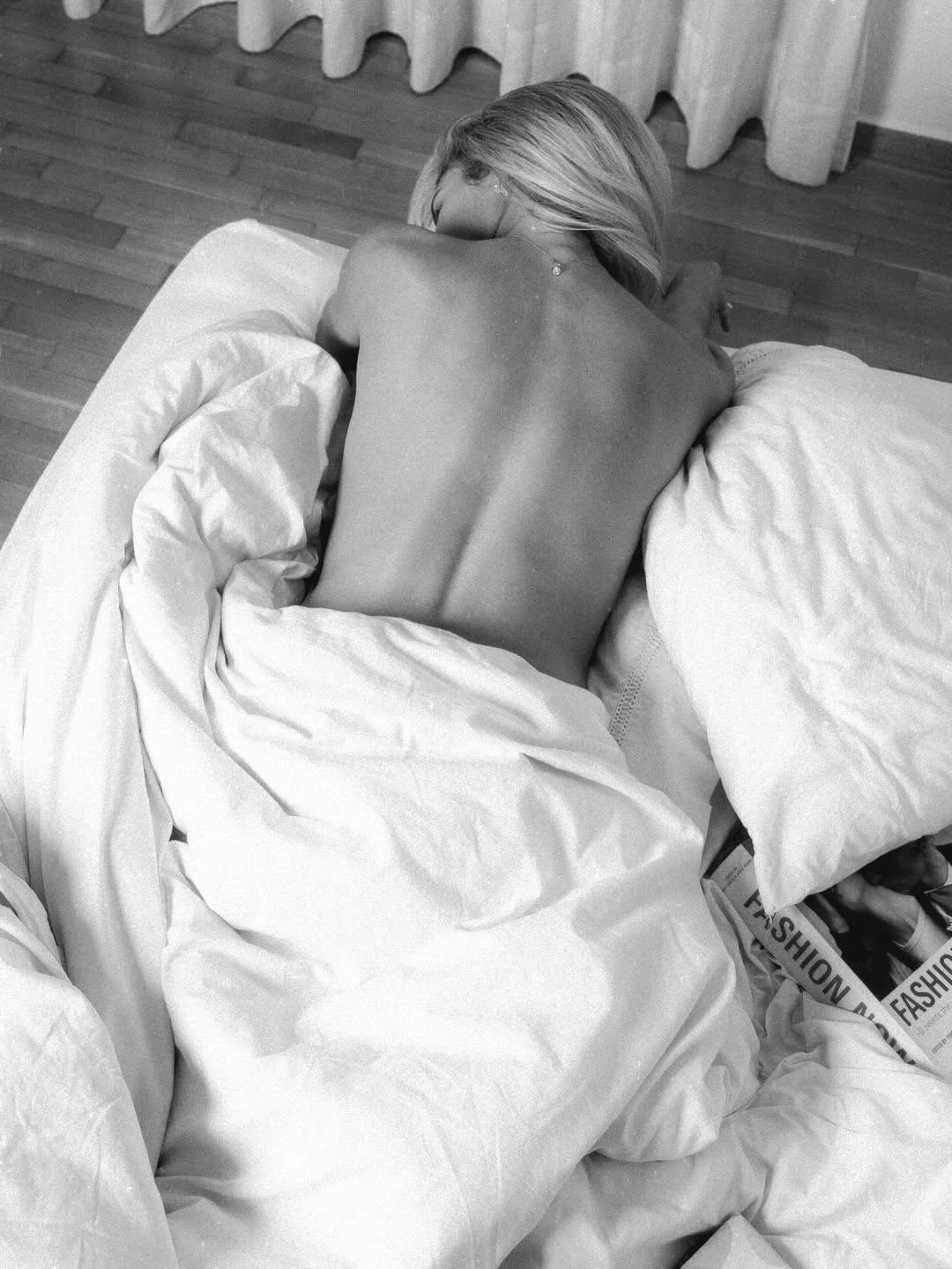 Στα στιγμιότυπα τη βλέπουμε να είναι ξαπλωμένη σε λευκά σεντόνια, τόπλες, με το σώμα της να καλύπτεται διακριτικά, ενώ φοράει κοσμήματα από το προσωπικό της brand, Doukissa Nomikou Collection.