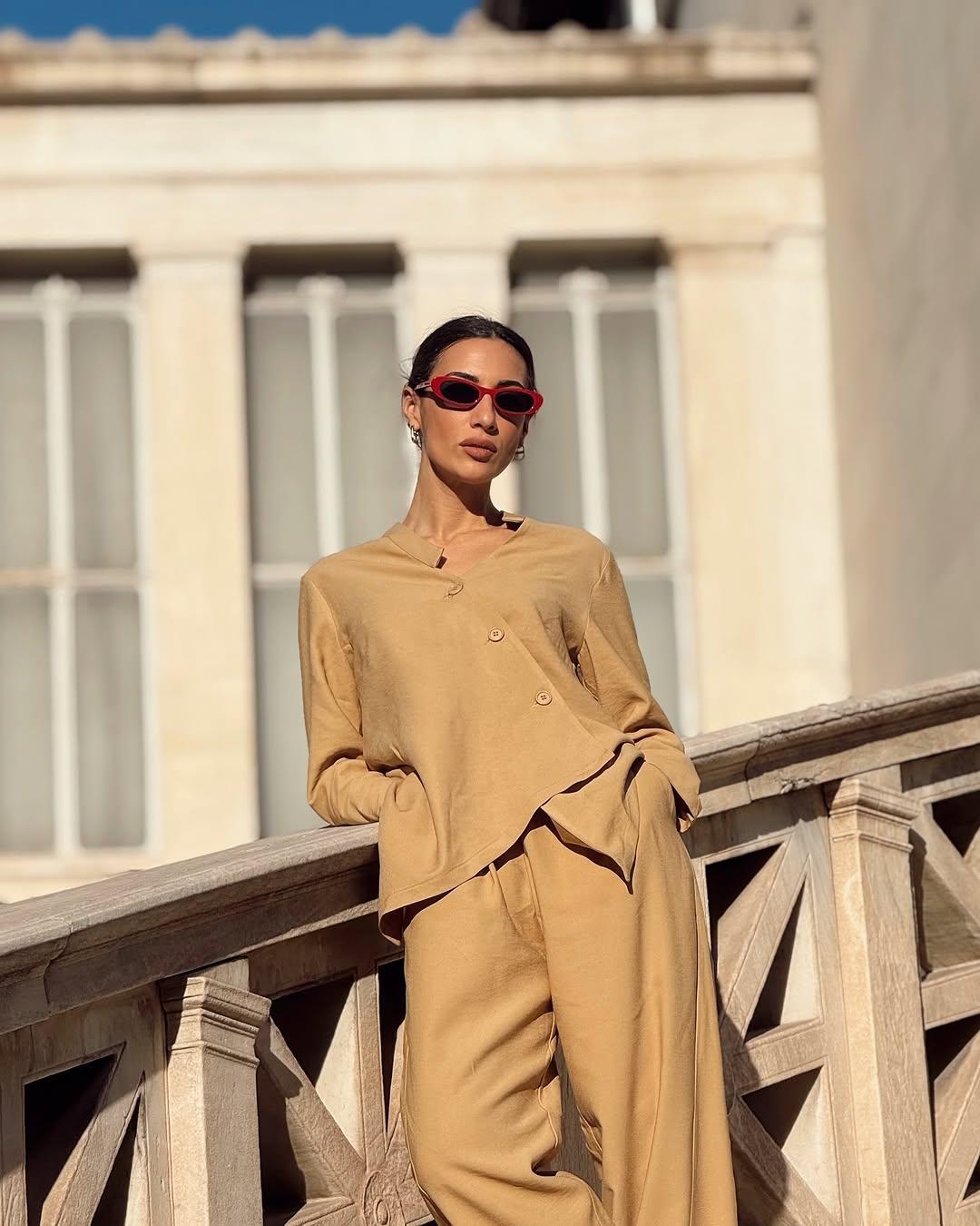 Η πινελιά που απογειώνει την εμφάνιση είναι τα κόκκινα γυαλιά ηλίου σε ρετρό στιλ, που δίνουν χαρακτήρα στο outfit, το οποίο είναι ιδανικό τόσο για το γραφείο όσο και για μια έξοδο.