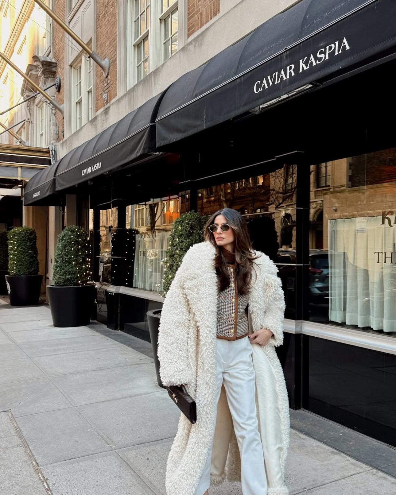 Στις φωτογραφίες της στη Νέα Υόρκη τη βλέπουμε να υιοθετεί δύο από τις πιο hot τάσεις του χειμώνα: Το γούνινο παλτό και το λευκό τζιν.