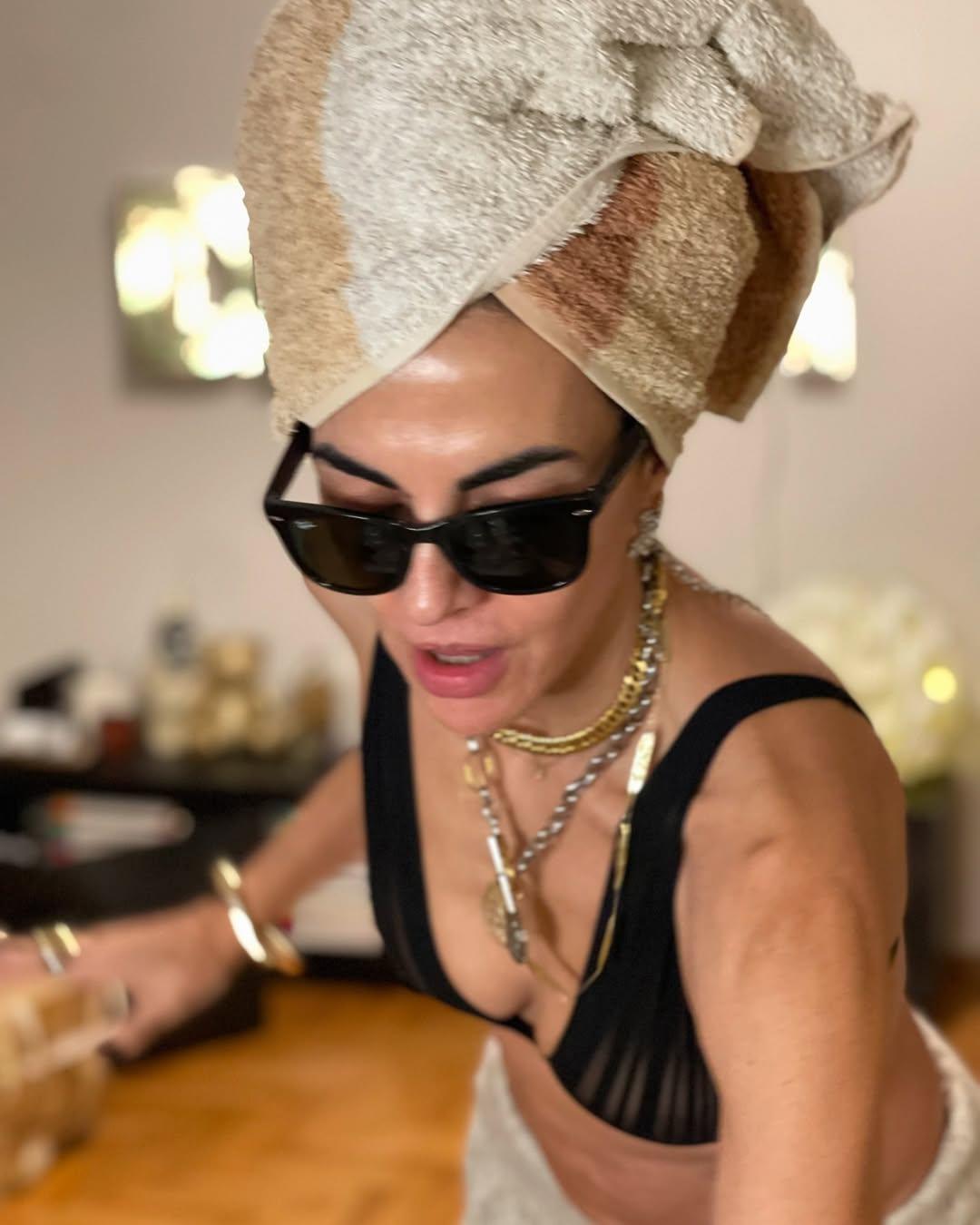 Στην ανάρτηση, η ηθοποιός ποζάρει με χαμόγελο, με μια πετσέτα τυλιγμένη στα μαλλιά, πιτζάμα και σουτιέν, απολαμβάνοντας μια χαλαρή στιγμή στον καναπέ της.