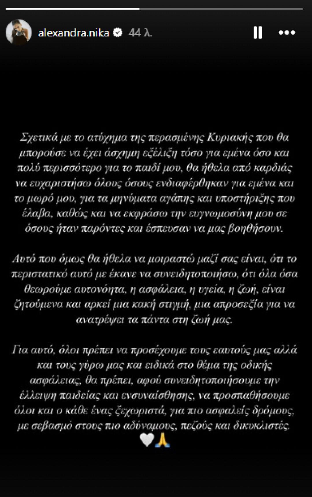 Η σύζυγος του Κωνσταντίνου Αργυρού και μητέρα του παιδιού του, ευχαρίστησε όσους στάθηκαν στο πλευρό της και έσπευσαν να βοηθήσουν, ενώ έστειλε ένα μήνυμα για την οδική ασφάλεια, τονίζοντας πως «η ζωή, η υγεία και η ασφάλεια δεν είναι δεδομένα – και μια στιγμή απροσεξίας αρκεί για να τα ανατρέψει όλα».