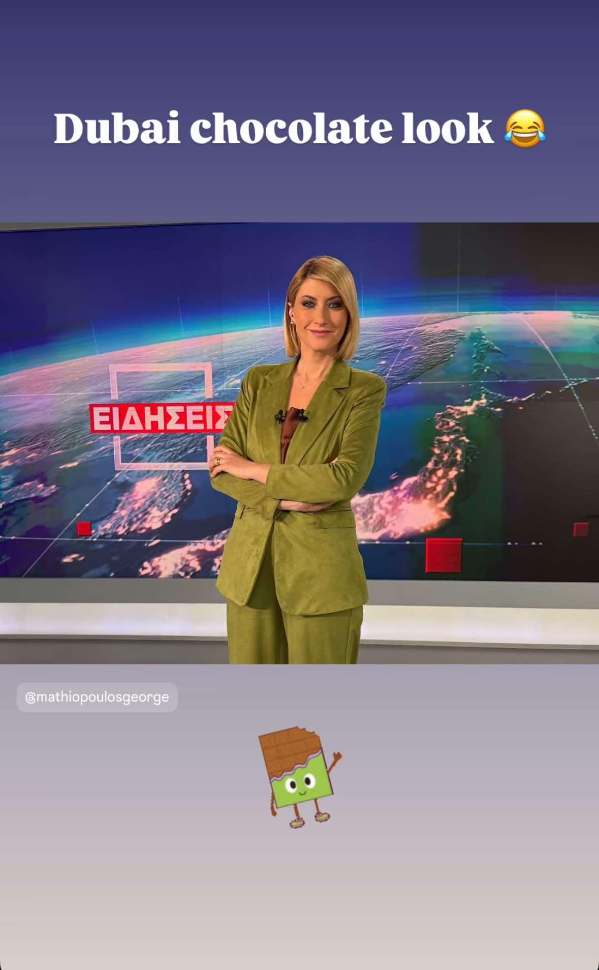 Ετσι έγινε και το βράδυ της Παρασκευής όταν η Σία Κοσιώνη αποφάσισε να «αυτοτρολαριστεί» για το ντύσιμό της στο δελτίο ειδήσεων, το οποίο χαρακτήρισε ως το απόλυτο «Dubai chocolate look».
