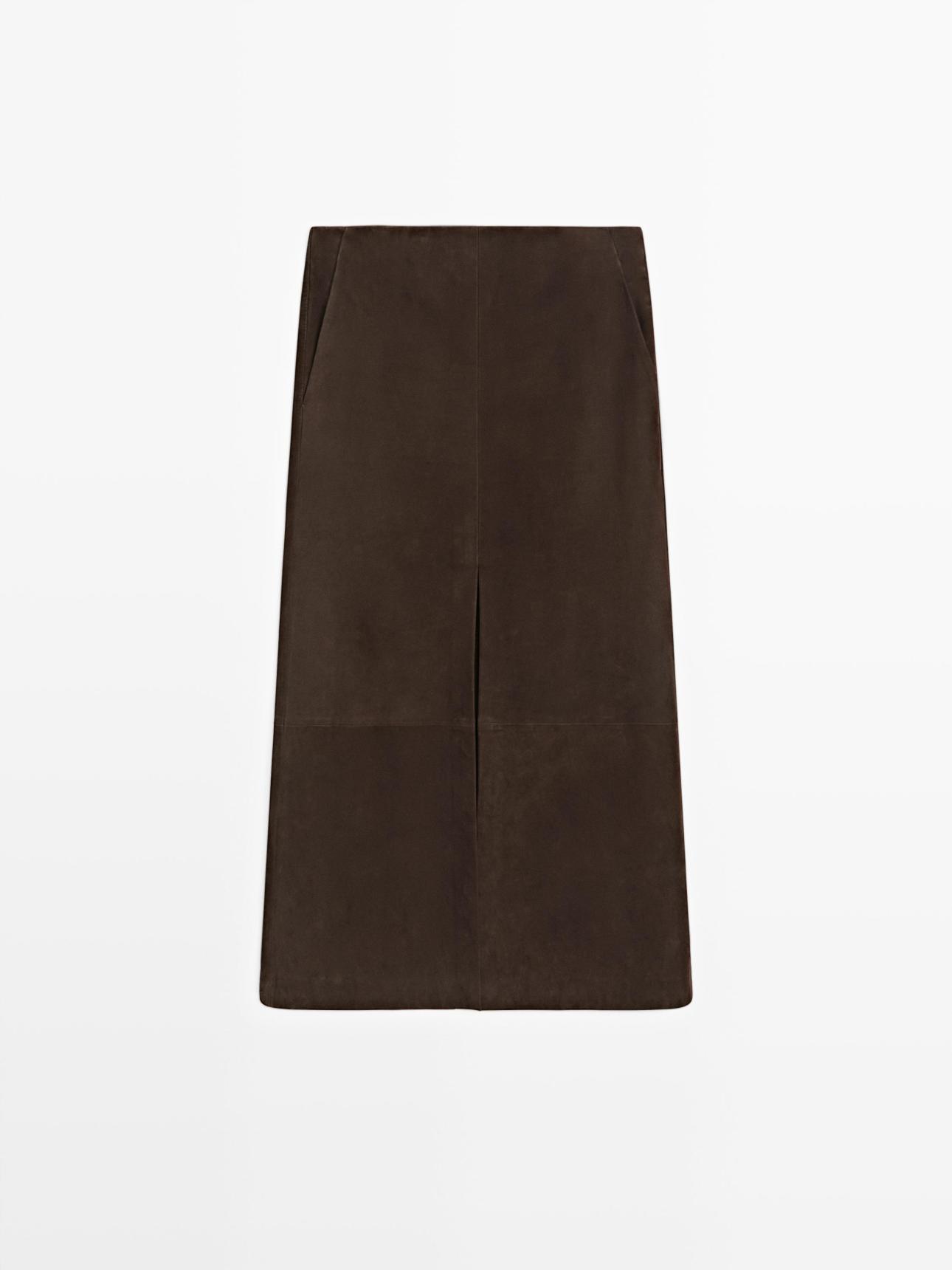 Βασικό στοιχείο της εμφάνισης είναι η σουέτ μίντι φούστα σε γήινη καφέ απόχρωση. Το σουέτ αποτελεί μία από τις πιο δυνατές τάσεις των τελευταίων σεζόν, καθώς προσθέτει πολυτέλεια ακόμα και στα πιο απλά σύνολα. Η μίντι γραμμή διατηρεί το look επαγγελματικό, ενώ παράλληλα κολακεύει τη σιλουέτα και προσφέρει άνεση στην κίνηση. Πρόκειται για ένα κομμάτι-επένδυση που μπορεί να φορεθεί από το γραφείο μέχρι ένα after-work ποτό, απλώς αλλάζοντας αξεσουάρ.