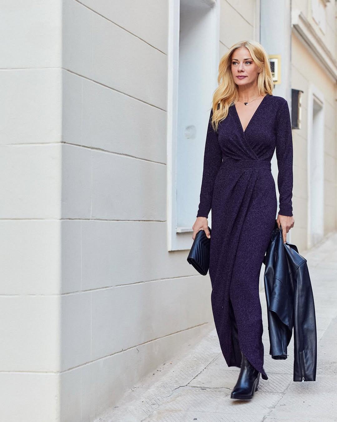 Συγκεκριμένα η Ζέτα Μακρυπούλια φόρεσε ένα μάξι wrap φόρεμα με διακριτική λάμψη. Ξεπέρασε τα συνηθισμένα με τις νέες τάσεις και επέλεξε μωβ χρώμα που είναι εξίσου όμορφο και εντυπωσιακό. Το look ολοκλήρωσε με cowboy boots και δερμάτινο jacket σε σκούρα μωβ απόχρωση.
