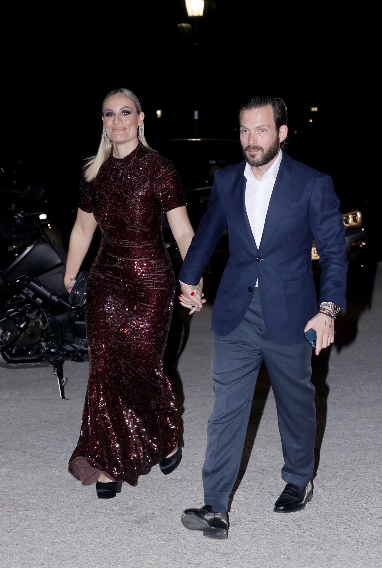 Η ίδια για την περίσταση επέλεξε να φορέσει ένα glam μπορντό maxi φόρεμα, όλο παγιέτα και μαύρες ψιλοτάκουνες γόβες με φιάπα.