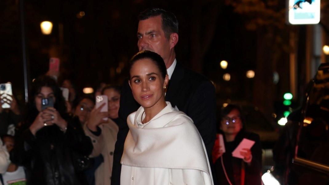 Η Μέγκαν Μαρκλ επέλεξε μια λευκή, φαρδιά κάπα πάνω από ένα λευκό πουκάμισο και παντελόνι στην ίδια απόχρωση. Ολοκλήρωσε το look με μαύρες γόβες μυτερής μύτης και διακριτικά μαύρα αξεσουάρ, ενώ τα μαλλιά της ήταν πιασμένα στον χαρακτηριστικό, αυστηρό κότσο που έχει γίνει το σήμα κατατεθέν της.