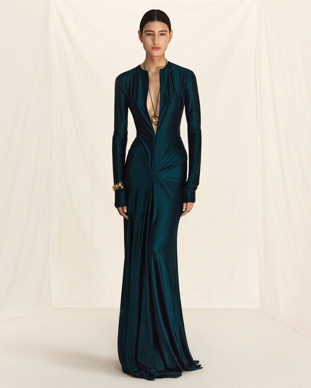 Το φόρεμα, αξίας 1.900 ευρώ, ξεχωρίζει για τη ρευστή και προσεγμένα σχεδιασμένη σιλουέτα του. Με βαθύ V ντεκολτέ που τονίζεται από το φερμουάρ μπροστά, μακριά μανίκια, ζωνάρι εμπνευσμένο από την ελληνική αισθητική στη μέση και φούστα που ανοίγει διακριτικά σαν ουρά γοργόνας, το φόρεμα συνδυάζει κομψότητα και θηλυκότητα.