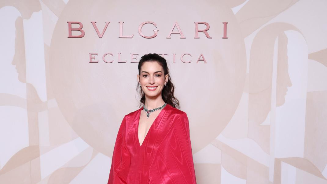 Η Αν Χάθαγουεϊ σταρ μαγνήτισε όλα τα βλέμματα σε εκδήλωση της Bulgari, φορώντας μια μεγαλειώδη κατακόκκινη τουαλέτα Valentino. Το εντυπωσιακό αυτό κομμάτι ξεχώριζε για το βαθύ ντεκολτέ του, το οποίο αναδείκνυε το περιδέραιο «Secret Garden», μια πολυτελή δημιουργία με διαμάντια, σμαράγδια, όνυχα, καθώς και μωβ και ροζ ζαφείρια, με πρωταγωνιστή ένα σπάνιο ροζ-πορτοκαλί ζαφείρι «Padparadscha» από τη Σρι Λάνκα. Τα φαρδιά μανίκια κατέληγαν σε μια ρευστή κάπα στην πλάτη, ενώ η ογκώδης φούστα ολοκληρωνόταν με μια κομψή ουρά. Πρόκειται για μία θεατρική εμφάνιση που φέρνει αναπόφευκτα στο μυαλό την εμβληματική εμφάνιση της Μέριλ Στριπ ως Μιράντα Πρίσλεϊ.