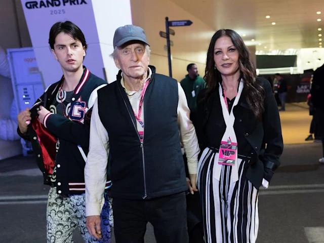 Στην ίδια χρωματική παλέτα και το ντύσιμο του συζύγου της Μάικλ Ντάγκλας που φορούσε άνετα αθλητικά ρούχα και παπούτσια καθώς και ένα jockey. Στην ίδια στιλιστική διάθεση και ο γιος τους Ντίλαν που είχε επιλέξει μεν ασπρόμαυρο look αλλά τα ρούχα του ήταν γεμάτα μοτίβα που έδιναν έναν πιο funky χαρακτήρα στην εμφάνισή του.