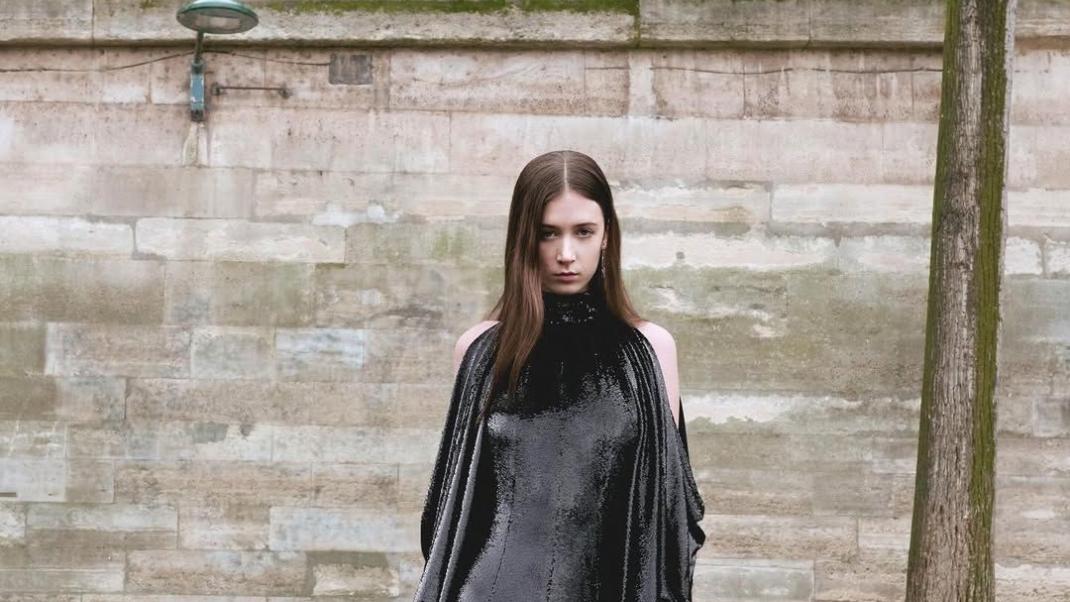 Σε μία από τις εικόνες ποζάρει σε λιθόστρωτο δρόμο, φορώντας μαύρο φόρεμα με παγιέτες, ψηλό λαιμό και ντραπέ μανίκια με έντονα ανοίγματα στους ώμους.