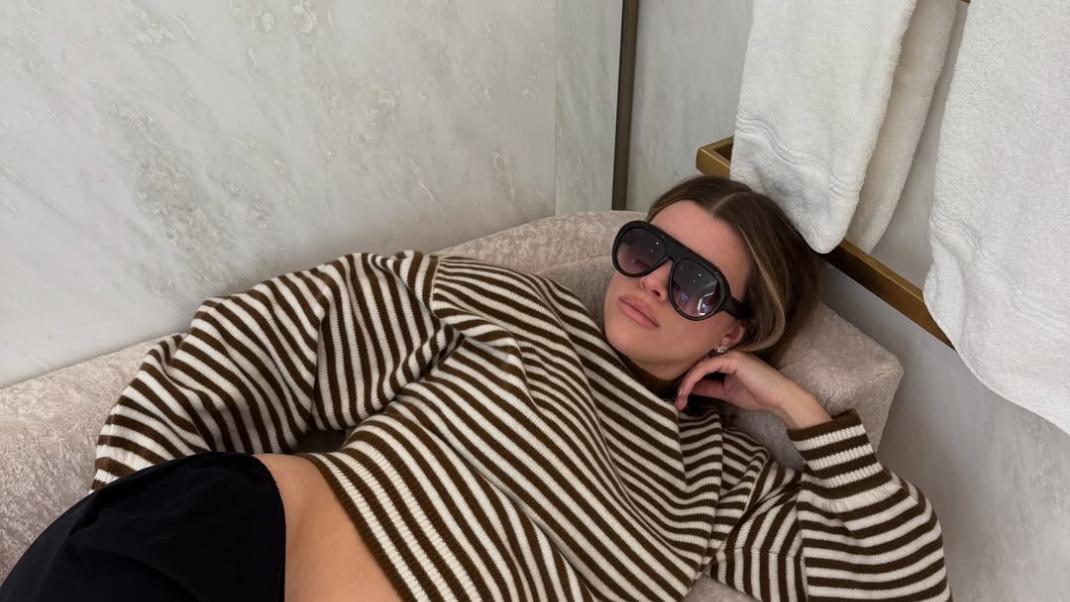 Με ένα cozy καφέ-κρεμ ριγέ πουλόβερ που αγκάλιαζε τη φουσκωμένη κοιλιά της και μαύρο παντελόνι, η Σοφία Ρίτσι πόζαρε χαλαρά πάνω σε έναν μπεζ καναπέ, διατηρώντας το χαρακτηριστικό στιλ της. Η χωρίστρα στη μέση και τα μαύρα aviator γυαλιά ηλίου ολοκλήρωναν το chic minimal look της.