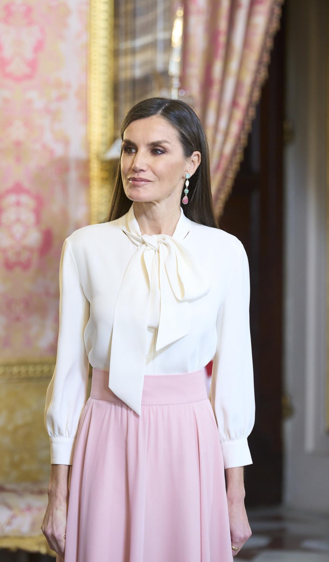 Η Λετίθια φόρεσε ένα σικάτο κρεμ πουκάμισο της σχεδιάστριας Carolina Herrera, το οποίο έχει φορέσει ξανά στο παρελθόν. Μάλιστα, το υπέροχο και ρομαντικό πουκάμισο που επέλεξε έχει μια θηλυκή λεπτομέρεια που το κάνει ακόμα πιο κομψό και είναι το αγαπημένο στιλ των royals. Ο λόγος για τον φιόγκο στον λαιμό, το λεγόμενο pussy bow.