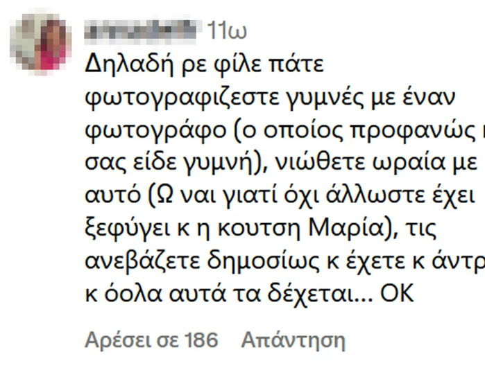 Και μπορεί οι περισσότεροι followers της, διάσημοι και μη, να την αποθέωσαν, υπήρξαν όμως και τα σχόλια εκείνων που βρήκαν τις πόζες της προκλητικές, με κάποιους να σχολιάζουν μεταξύ άλλων αρνητικά το γεγονός ότι ο φωτογράφος την είδε γυμνή.