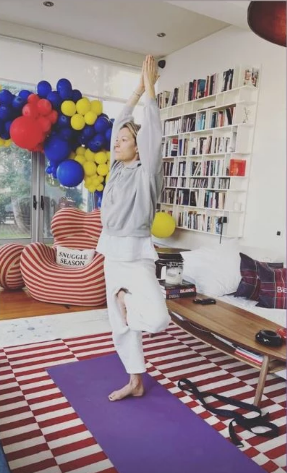 Στα stories που μοιράστηκε η αγαπημένη παρουσιάστρια το πρωί της Πέμπτης, μπορούμε να θαυμάσουμε τη χαρμόσυνη κατοικία της, ένα σπίτι γεμάτο χρωματιστές πινελιές! Το πάτωμα και οι τοίχοι είναι ένας λευκός καμβάς, και τα πολύχρωμα αξεσουάρ έρχονται για να ανεβάσουν τη διάθεση: Ένα έντονο ποπ χαλί με κόκκινες ρίγες και μια ασορτί πολυθρόνα, ένα ξύλινο τραπεζάκι σαλονιού, αλλά και αναρίθμητα πολύχρωμα μπαλόνια κοσμούν το σαλόνι της παρουσιάστριας!