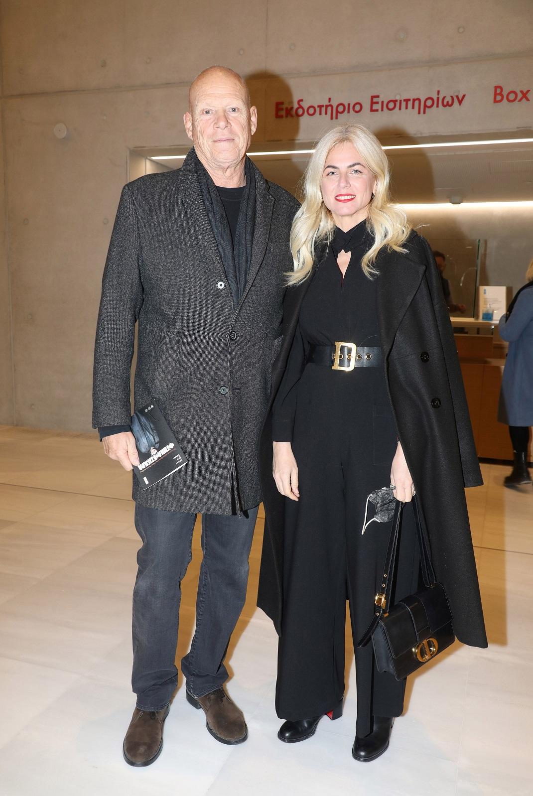 Η Χριστίνα Κοντοβά με κομψή μαύρη ολόσωμη φόρμα, σε θεατρική πρεμιέρα με τον Τζώνη Καλημέρη
