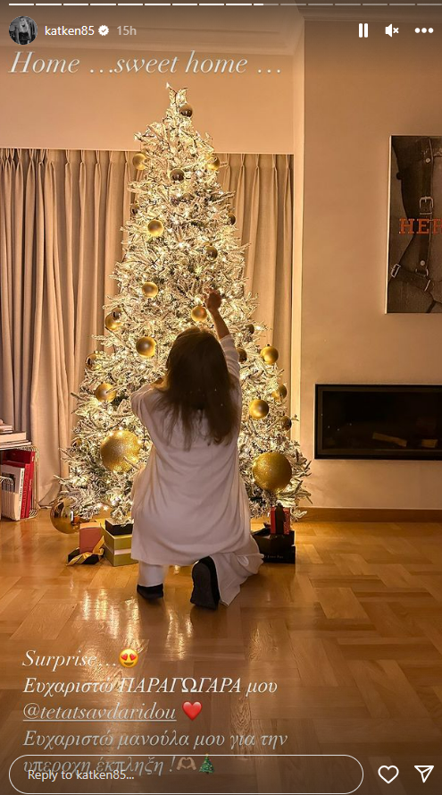 Οι φωτογραφίες που δημοσίευσε σε Instagram story η Κατερίνα Καινούργιου, δείχνουν τη μητέρα της μπροστά από το στολισμένο χριστουγεννιάτικο δέντρο στο σαλόνι.