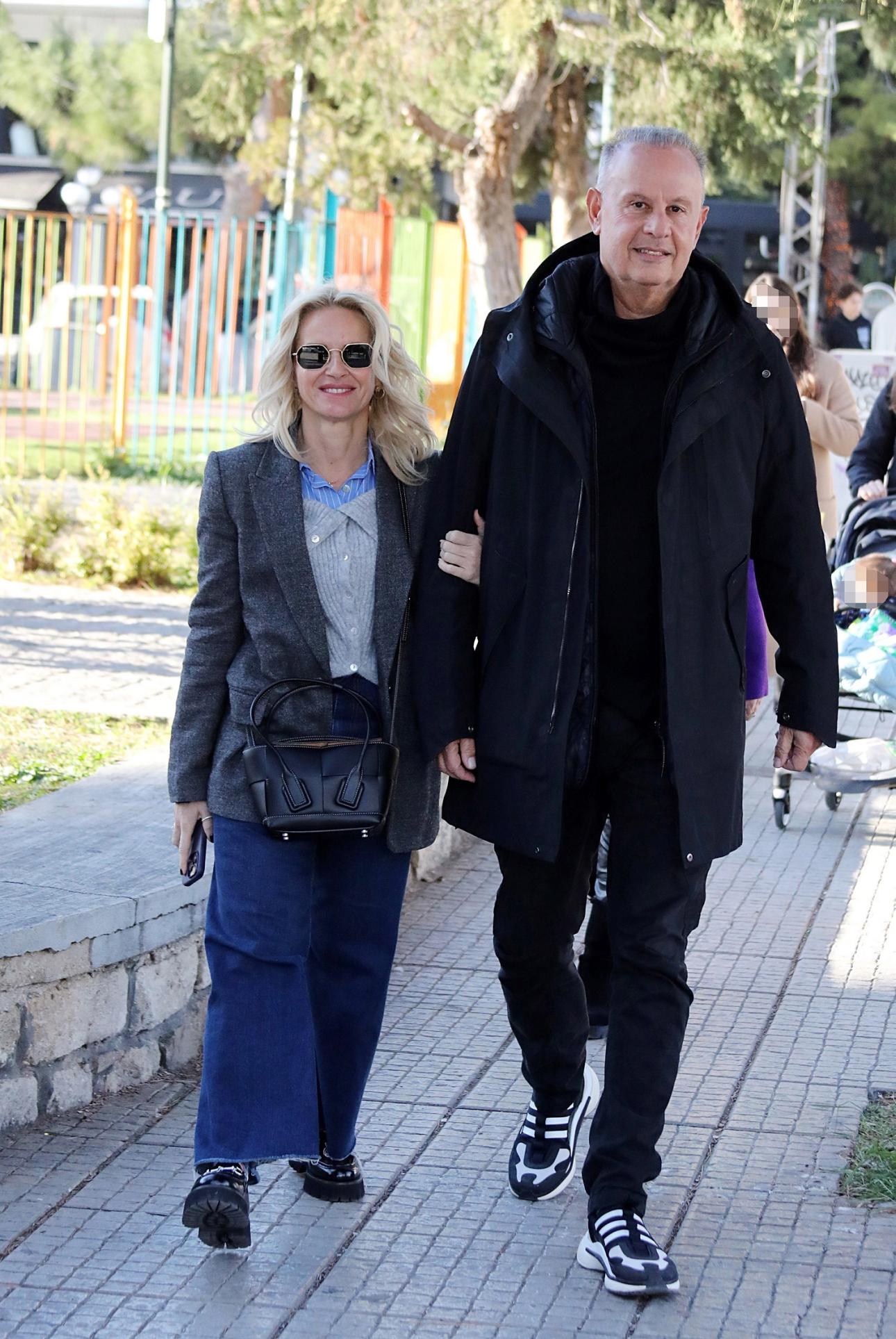 Δίπλα της, ο σύζυγός της Αντώνης Αλεβιζόπουλος φορούσε ένα σύνολο σε σκούρες αποχρώσεις, με ένα μακρύ αθλητικό μπουφάν και μαύρα sneakers με λευκές λεπτομέρειες.