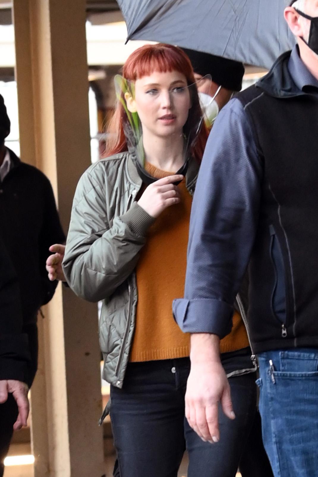 Η 30χρονη Τζένιφερ Λόρενς εθεάθη με κατακόκκινα μαλλιά και κοντές αφέλειες στα γυρίσματα της νέας της ταινίας «Don't Look Up» με τον Λεονάρντο Ντι Κάπριο.