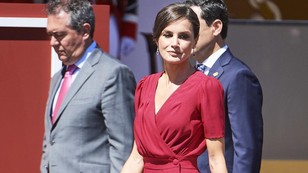 Η βασίλισσα Λετίθια με κόκκινο μίντι φόρεμα και nude slingbacks