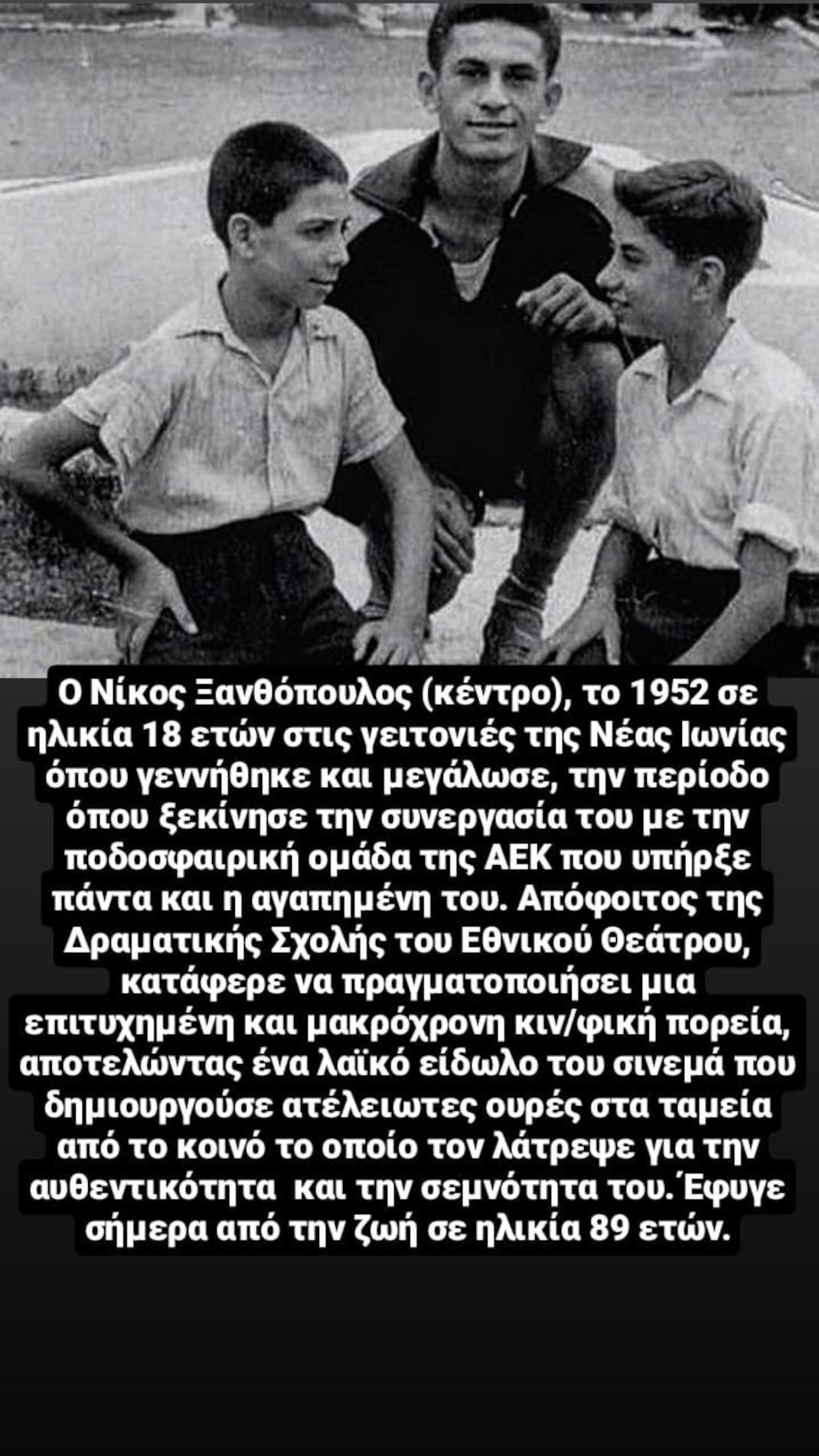 Στη λεζάντα της φωτογραφίας σημειώνεται: «Ο Νίκος Ξανθόπουλος το 1952 σε ηλικία 18 ετών στις γειτονιές της Νέας Ιωνίας όπου γεννήθηκε και μεγάλωσε, την περίοδο όπου ξεκίνησε την συνεργασία του με την ποδοσφαιρική ομάδα της ΑΕΚ που υπήρξε πάντα η αγαπημένη του.