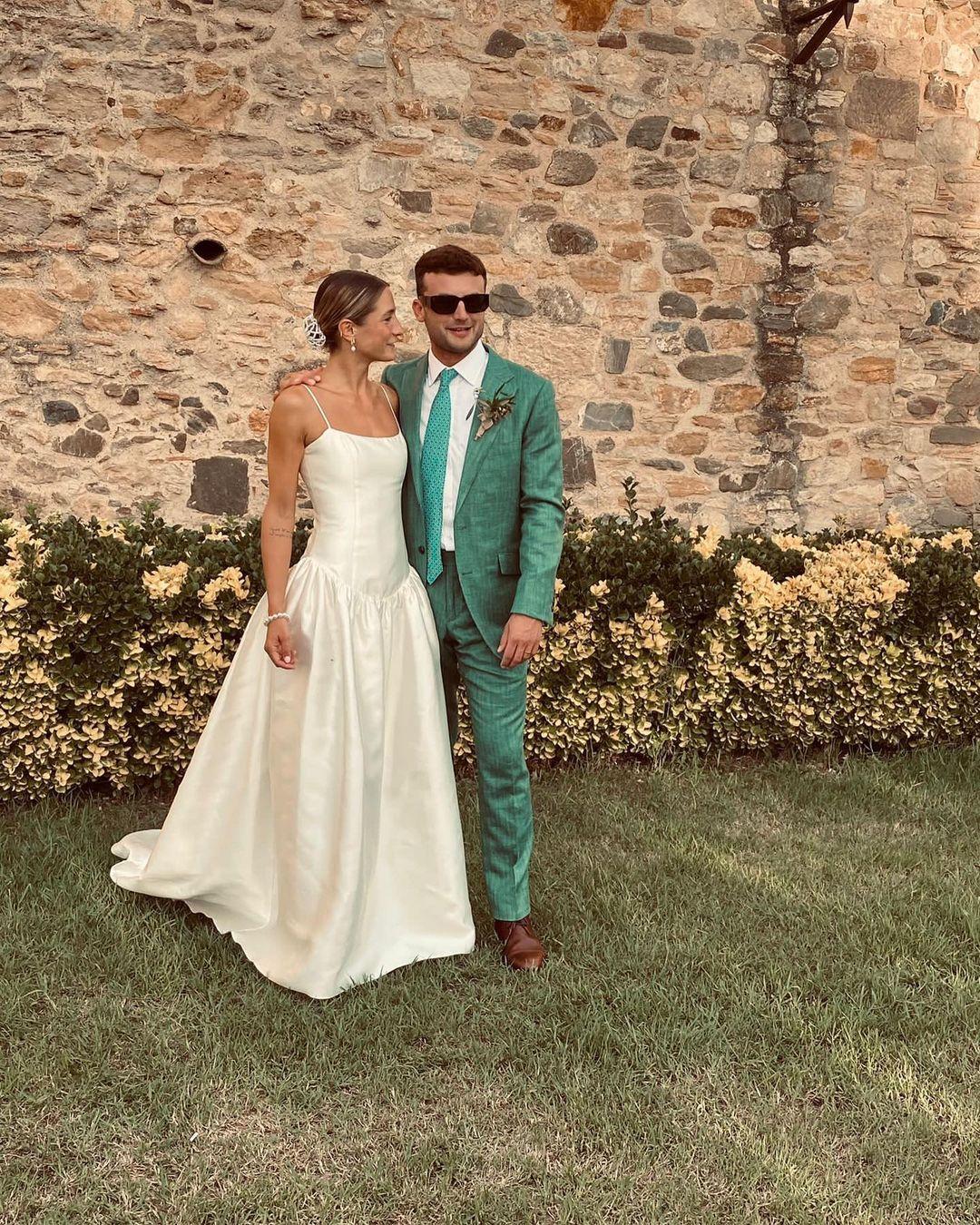 Το νυφικό της Gemma Sort Chilvers ήταν δημιουργία του οίκου The Own Studio, από σατέν ύφασμα με μινιμαλιστικό στιλ και με μπούστο σε σχήμα V. «Ήταν κομψό και είχε μια χαλαρή αίσθηση», θυμάται στην ισπανική Vogue.