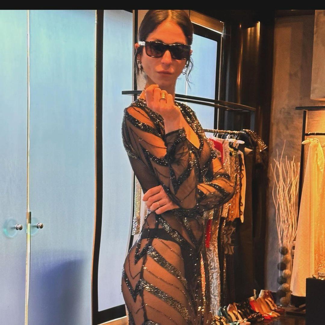 Το μαύρο φόρεμα είναι διάφανο και η Σοφία Καρβέλα ποζάρει με στιλ στον φακό, φορώντας μαύρα γυαλιά ηλίου.