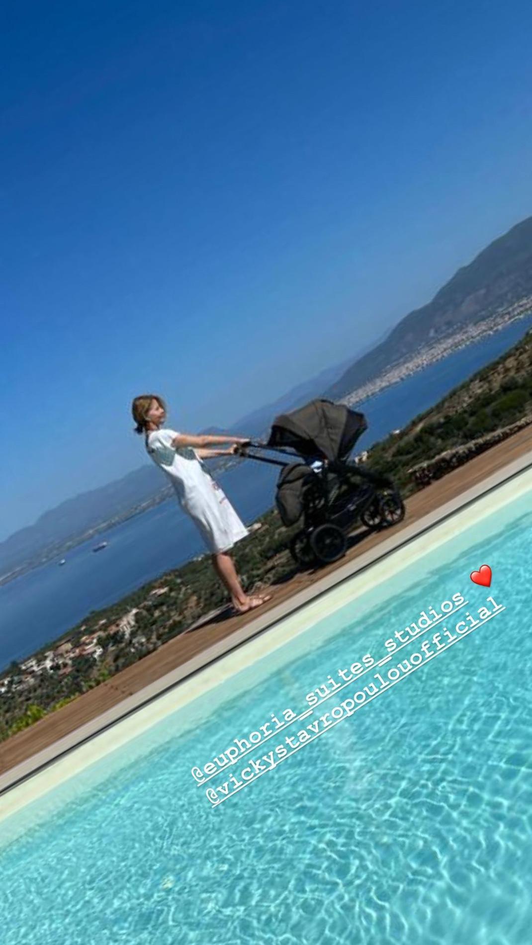Η ευτυχισμένη μητέρα, μάλιστα, δημοσίευσε στα Instagram stories μια φωτογραφία με τον γιο της στο καροτσάκι, να περπατά στην πισίνα, αλλά και μία φωτογραφία της Βίκυς Σταυροπούλου.